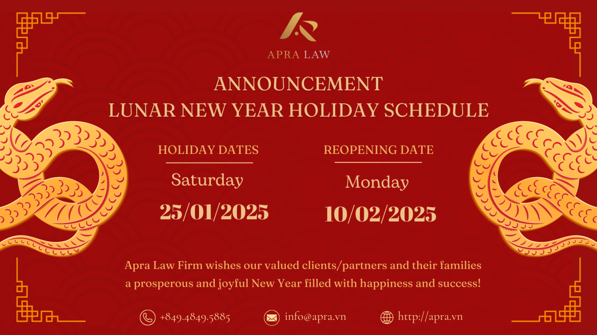 ANNOUNCEMENT LUNAR NEW YEAR HOLIDAY SCHEDULE 2025 by Apra Law 2025-01-24 Related Posts APRA LAW JOINS THE INVESTMENT PROMOTION EVENT “HANOI... 2024-11-27 APRA LAW’S 5TH ANNIVERSARY 2024-09-09 SIGNING AGREEMENT BETWEEN APRA LAW AND SALITO 2021-12-29 APRA LAW PARTICIPATES IN VIETNAM LAW’S CONFERENCE ON... 2021-12-29